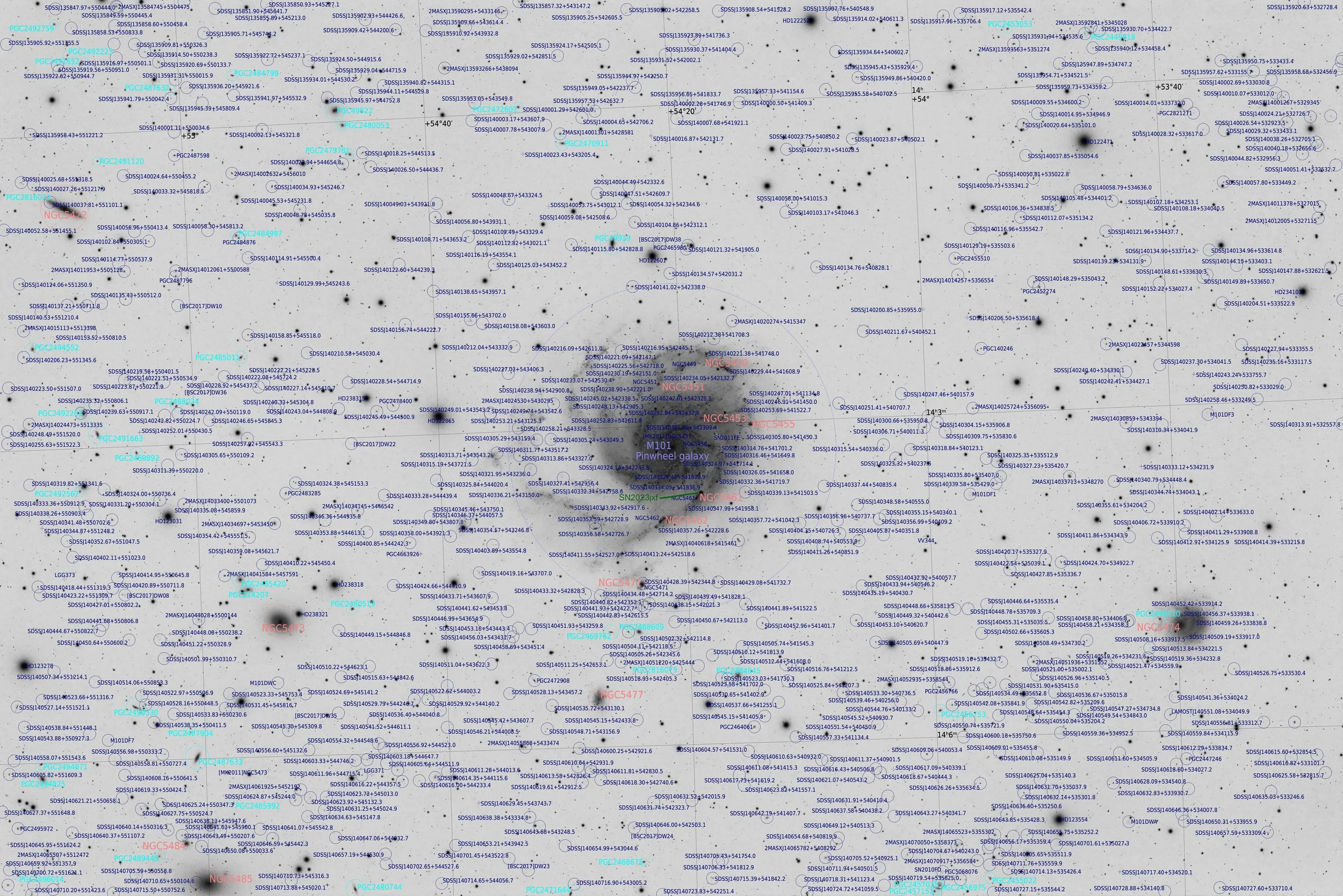 This image also shows supernova SN2023ixf located near NGC 5461 in one of M101's spiral arms. It is marked in dark green in the negative image provided. This supernova was first detected on May 19th, 2023 by an amateur astronomer in Japan named Koichi Itagaki. From looking at its spectrum, it was classified as a Type II core collapse supernova. The suspected progenitor star likely had a mass roughly fifteen times greater than the Sun. The peak brightness for this supernova was 10.8 meaning that at its brightest, the supernova was about 1/15th as bright as the entire Pinwheel galaxy--roughly 1.5 billion times brighter than the Sun.