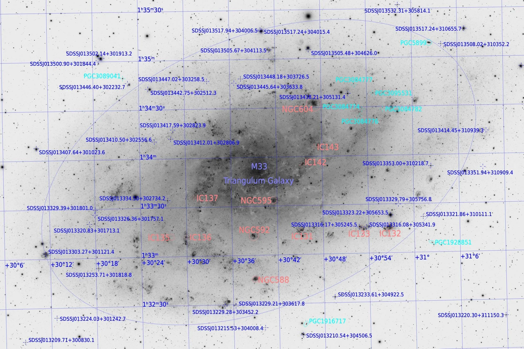 Due to its relative proximity, M33 can fill the field of view of even a moderate aperture telescope, and it is a favorite subject for professionals and amateurs alike since it is possible to distinguish a large number of individual stars within the galaxy rather than just nebulosity from stars that are too far away to resolve. In fact, in a recent mosaic of images from the Hubble Space telescope, scientists were able to resolve twenty-five million individual stars in a region of space only 14,000 lightyears across. M33, like Andromeda, appears to be headed straight for the Milky Way galaxy, and the three galaxies may collide together in approximately four billion years.